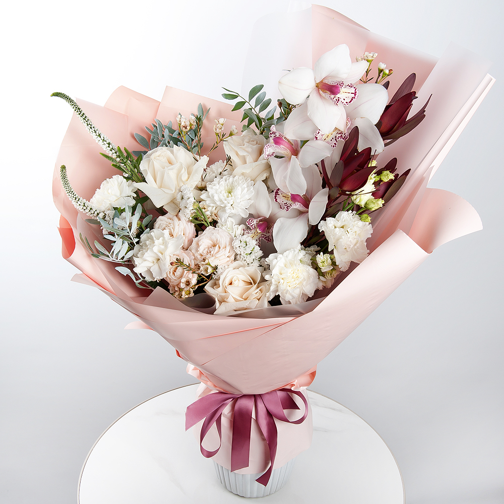 The "Snowy Dreams" bouquet is the embodiment of tenderness and beauty that will leave no one indifferent. This bouquet harmoniously combines "Cymbidium" orchids, white "Ecuador" roses, spray roses, chrysanthemums, carnations, lisianthus, stock flowers, leucadendron, pistachio, and statice. Each flower brings its own unique accent to the overall composition. The "Snowy Dreams" bouquet will make a wonderful gift for any occasion. It is suitable for a birthday, anniversary, wedding, or any other celebration. Order the "Snowy Dreams" bouquet and give yourself or your loved ones unforgettable emotions!