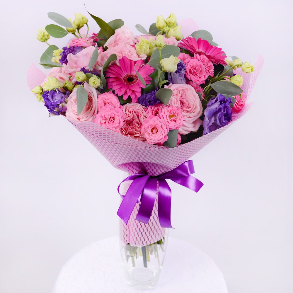 Can you express your sincere admiration, gratitude, love and tenderness with flowers? Of course you do, if they are collected in such a gorgeous and lush bouquet. Twenty-seven vibrant pink roses, perfectly matched with electric pink gerberas and passionate purple eustoma will help you to ignite a joyful spark in the recipient’s heart. Surprise your loved ones and make their hearts tremble with happiness!