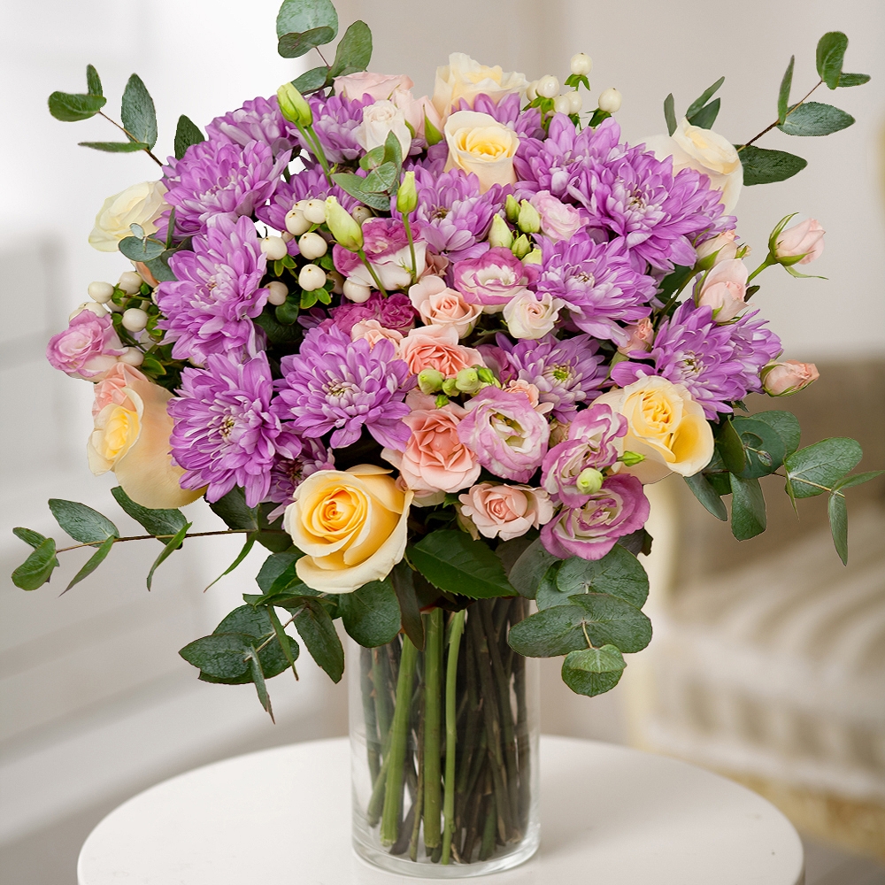 The "Spark of Happiness" bouquet is a bright and stylish gift that will give the recipient unforgettable emotions and impressions. The bouquet is composed of bush chrysanthemums, roses, cream roses, "Cineraria" eucalyptus, and hypericum. These flowers harmoniously combine with each other, creating a unique composition. Bush chrysanthemums symbolize longevity and happiness, roses represent love and tenderness, cream roses add sophistication and elegance to the bouquet, "Cineraria" eucalyptus gives freshness and lightness, and hypericum adds bright accents. The "Spark of Happiness" bouquet will make a wonderful gift for any occasion. It is suitable for expressing love, gratitude, respect, or simply as a sign of attention. We guarantee the high quality of our bouquets and timely delivery. Allow yourself and your loved ones to enjoy the beauty and brightness of the "Spark of Happiness" bouquet!