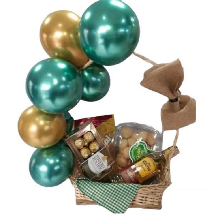 A decorated basket with a checkered tablecloth and balloons, Jose Cuervo tequila in the amount of 100 ml, biscuits, Ferrero Rocher 8 pieces each and doy pak peanut paste.