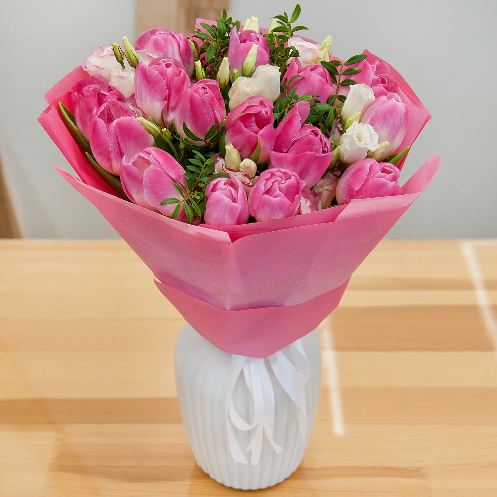 Bouquet "Spring Feeling" is the perfect combination of tenderness and brightness that will give your loved ones unforgettable emotions and a sense of spring freshness. This bouquet includes tulips, lisianthus, and pistachio, which together create a unique spring atmosphere.