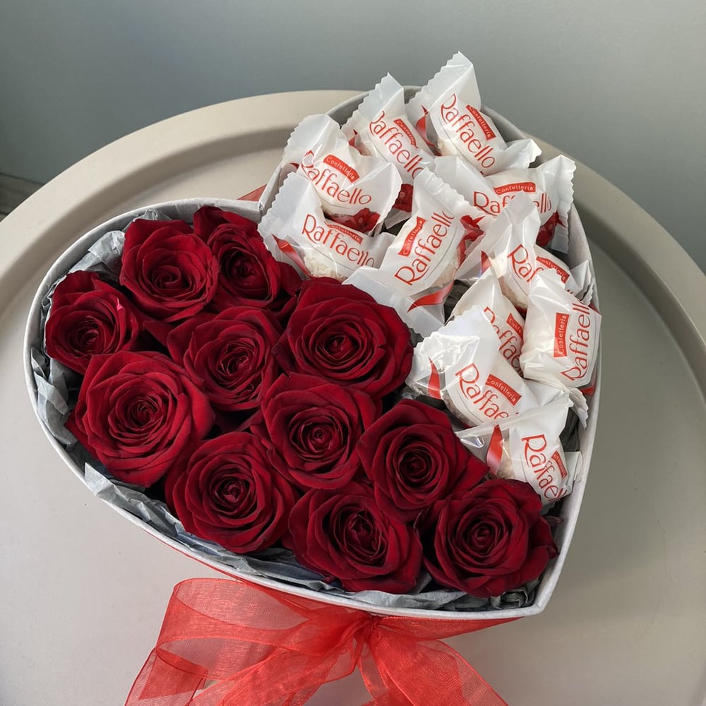 A bright heart-shaped composition consists of 11 red roses and Raffaello candies with almond 150g. in decorative design. The height of the composition is 10 cm.
