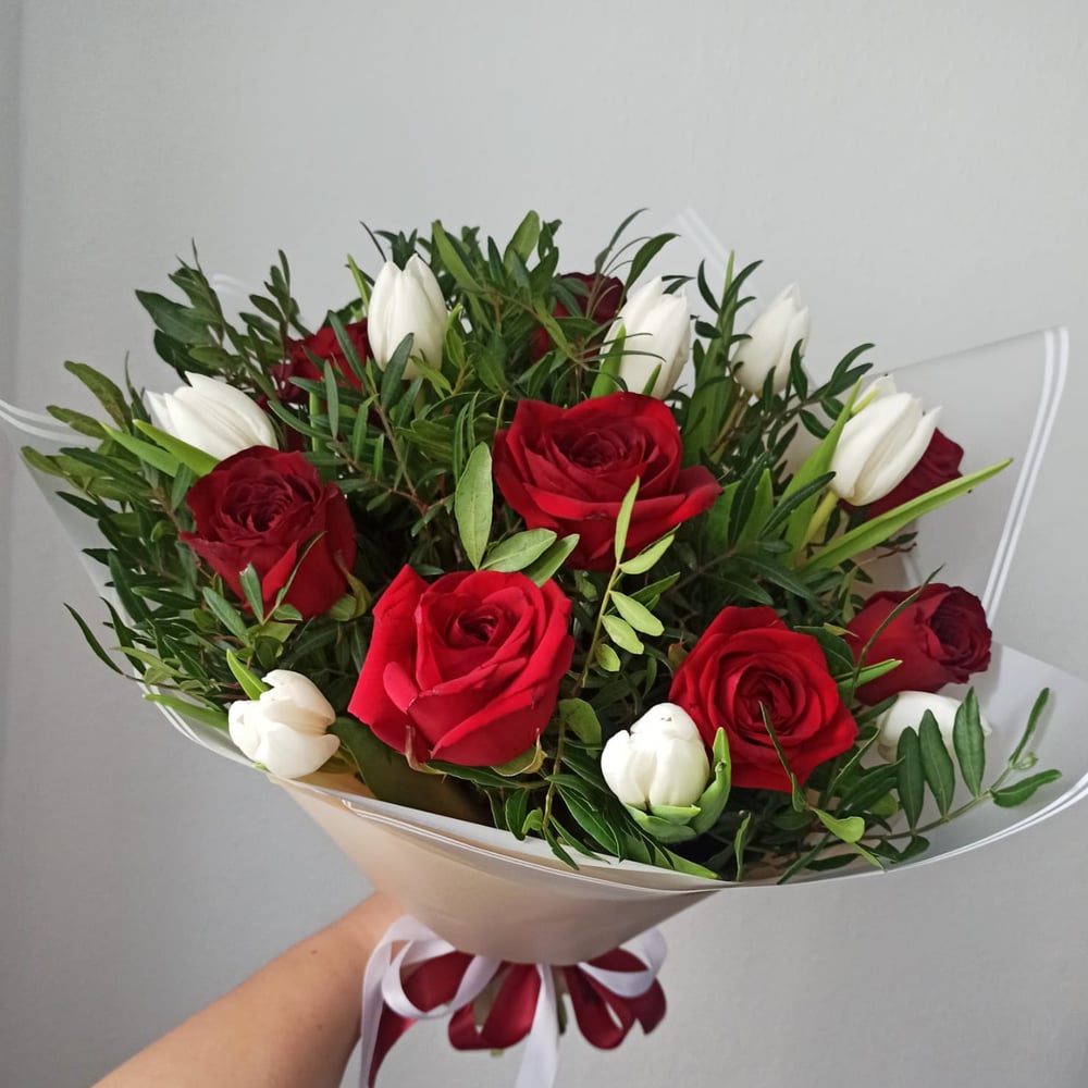 The combination of white and red buds symbolizes unity, union, harmony. A bouquet can be a declaration of love, a compliment, or a symbol of admiration for talent. Red roses represent love, White tulips - sincerity.