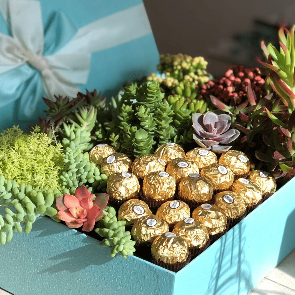 Arrangement of succulents with personalized chocolates. Floral box with succulents in soil and preferred sweets.