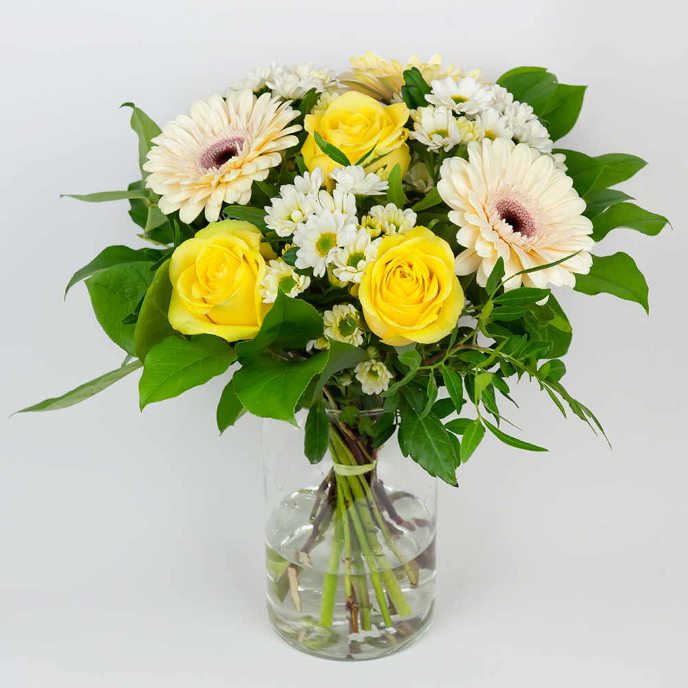 Sunny daisy gerberas, spray chrysanthemums and cheerful yellow roses are interwined in a beautiful bouquet that is sure to cause a happy smile.