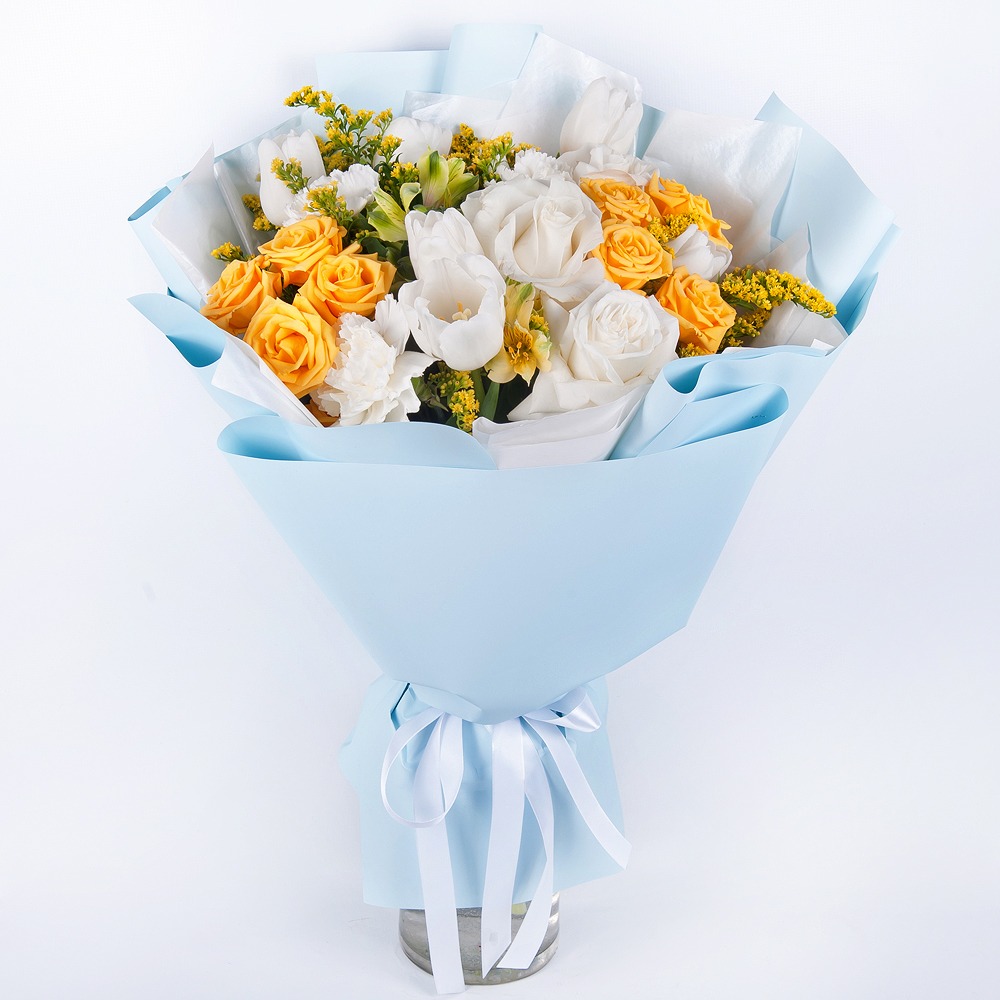 The "Sun in the Clouds" bouquet is a luxurious combination of white roses, alstroemerias, spray roses, carnations, tulips, and solidago, which will give the recipient a feeling of tenderness and spring mood. Each flower in this bouquet has its own meaning: white roses symbolize purity and innocence, alstroemerias add sophistication and elegance, spray roses - tenderness and beauty, carnations - resilience and longevity of feelings, tulips - spring awakening, and solidago - confidence and stability. Together they create a harmonious and stylish composition that is suitable for any occasion. The "Sun in the Clouds" bouquet can be arranged in various shades, from soft pastels to bright and saturated, allowing you to choose the option that suits you best. The "Sun in the Clouds" bouquet will make a wonderful gift for any occasion - from a romantic date to a corporate event. It will bring joy and admiration to the person you present it to. Don't miss the opportunity to delight your loved ones! Give them the "Sun in the Clouds" bouquet and give yourself the pleasure of their sincere joy!