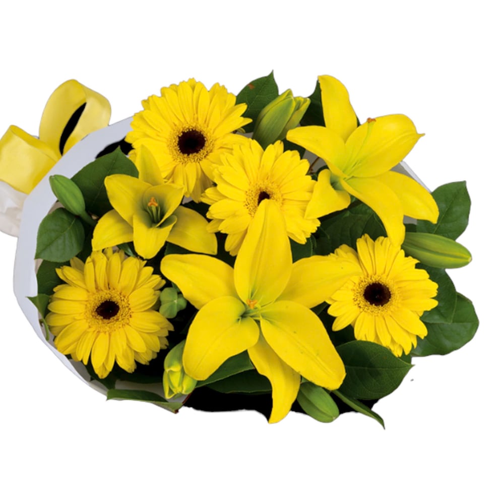Pure sunshine! Send sunny thoughts to someone special with this bouquet of warm yellow lilies and gerberas. Brighten their day and bring a smile to their face with these vibrant and cheerful flowers. The yellow hues symbolize happiness and joy, making it the perfect gift to uplift their spirits. Whether it's a birthday, anniversary, or just because, this bouquet is sure to make a lasting impression. Show someone you care and let the sunshine in with this beautiful arrangement.