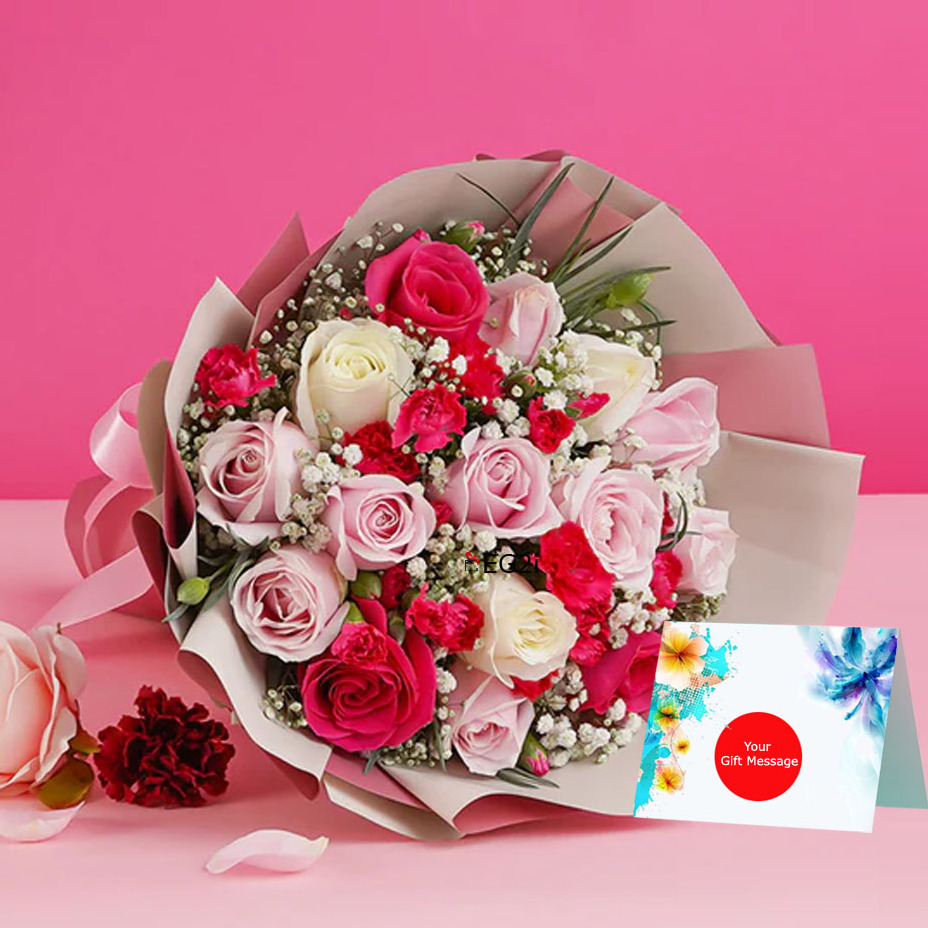 A roses and carnations bouquet is a beautiful and versatile floral arrangement that combines the elegance of roses with the charm and longevity of carnations. Itβs suitable for a wide range of occasions, from romantic gestures to celebrations and even heartfelt sympathy.Send This Exclusive Bouquet anywhere in India for his/her birthday, anniversary, Valentines, mothers day or any other occasions. Product Details:: Round bunch of Roses and Carnation Bouquet. Round bunch of 30pcs Dark Pink, Baby Pink and White Roses 20pcs dark Pink Carnation with and Gypsy Fillers Pink Paper with Pink Ribbon bow. Free Personalised Message Card.