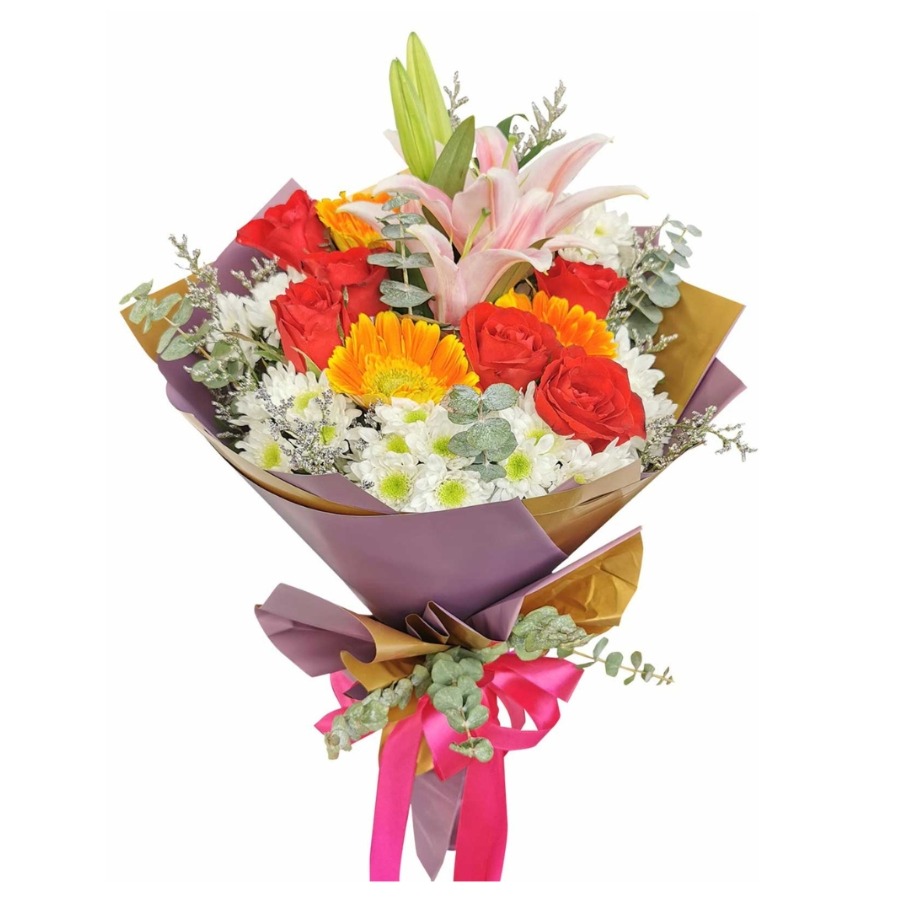 Mix pink lilies, red carnations, orange gerberas, and white chrysanthemums in a bouquet.