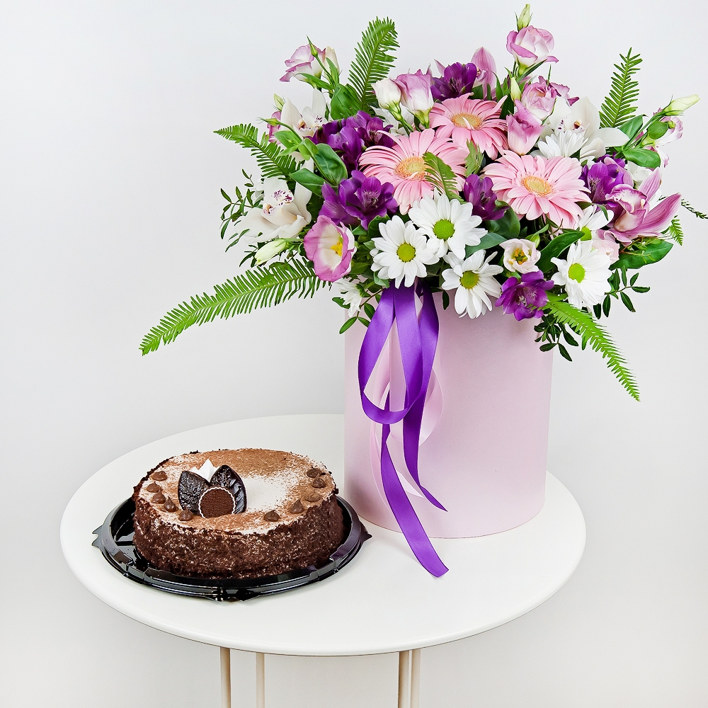 If you want to make a sophisticated compliment — this charming composition is just what you need. A fragrant bouquet in an English hat box, complemented by a sweet dessert, will tell her about your attention and tender care.