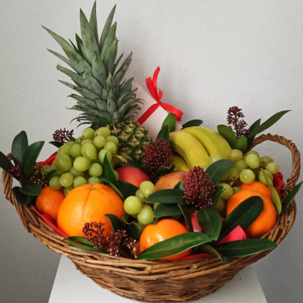 The fruit basket is a luxurious gift for loved ones. It contains all kinds of classic fruits: bananas, tangerines, grapes, oranges and apples. The fruit basket will delight you not only with the brightness of its fruits, but also with a multitude of wonderful summer aromas.