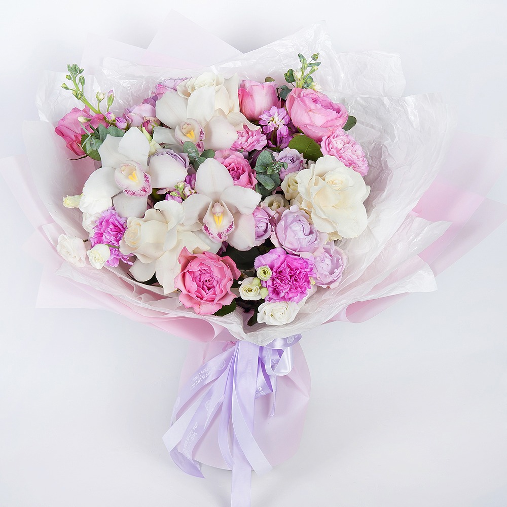 The "Unique Charm" bouquet is an exquisite combination of pink roses, peony-like shrub roses, carnations, stock, cymbidium orchids, and lisianthus (eustoma). White Ecuadorian roses and silver dollar eucalyptus add freshness and elegance. This bouquet will make a wonderful gift for any occasion and will highlight your care and attention.
