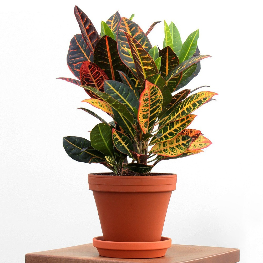 Codiaeum is a bright tropical flower native to the tropics of Malaysia. The color of its leaves shimmers with all the colors of the rainbow: yellow, red, pink, and orange with whimsical patterns of silver and bronze. In summer, the plant blooms with small white inflorescences that resemble fluffy balls.