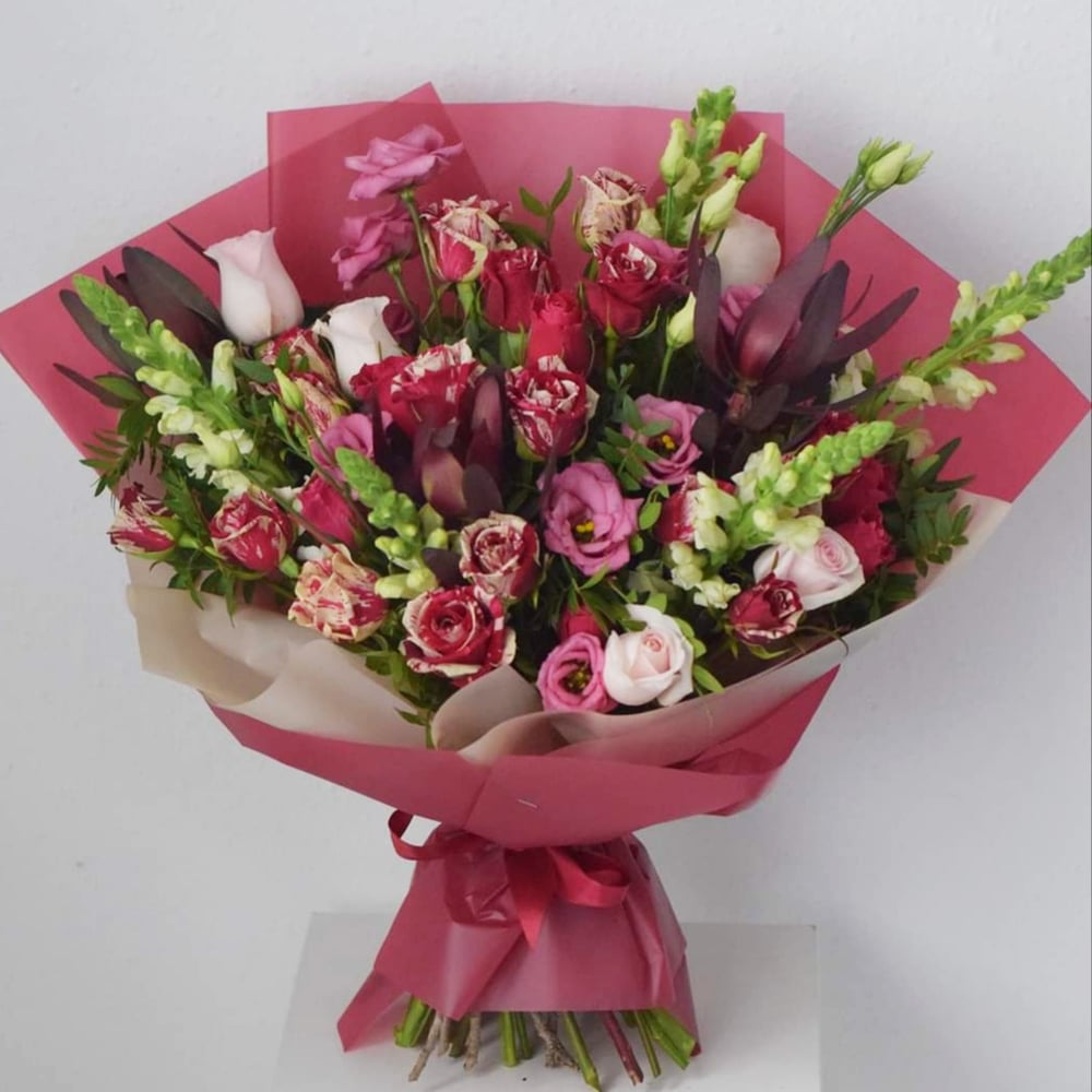 Light pink roses are harmoniously combined with marbled red and white roses, and pink lisianthus unites this combination of roses. As a result, you get a bright and delicate bouquet suitable for any occasion.
