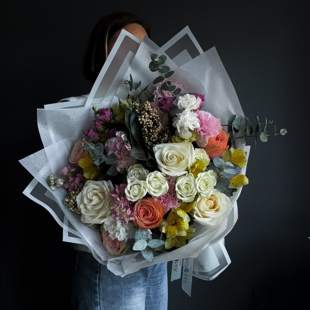 A bouquet featuring roses, spray roses, eucalyptus, peony-spray roses, and lisianthus.