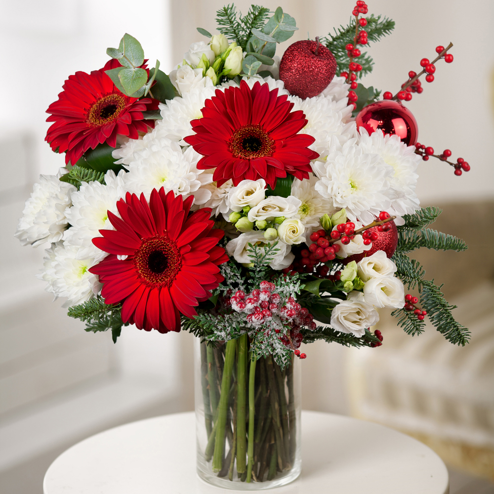 This beautiful seasonal bouquet is full of winter magic and Christmas cheer for your special someone. Tender white chrysanthemums and lisianthuses mixed with red gerberas and ilex in a frame of natural fir branches to deliver a Christmas spirit to your special recipient wherever they may be in the world.